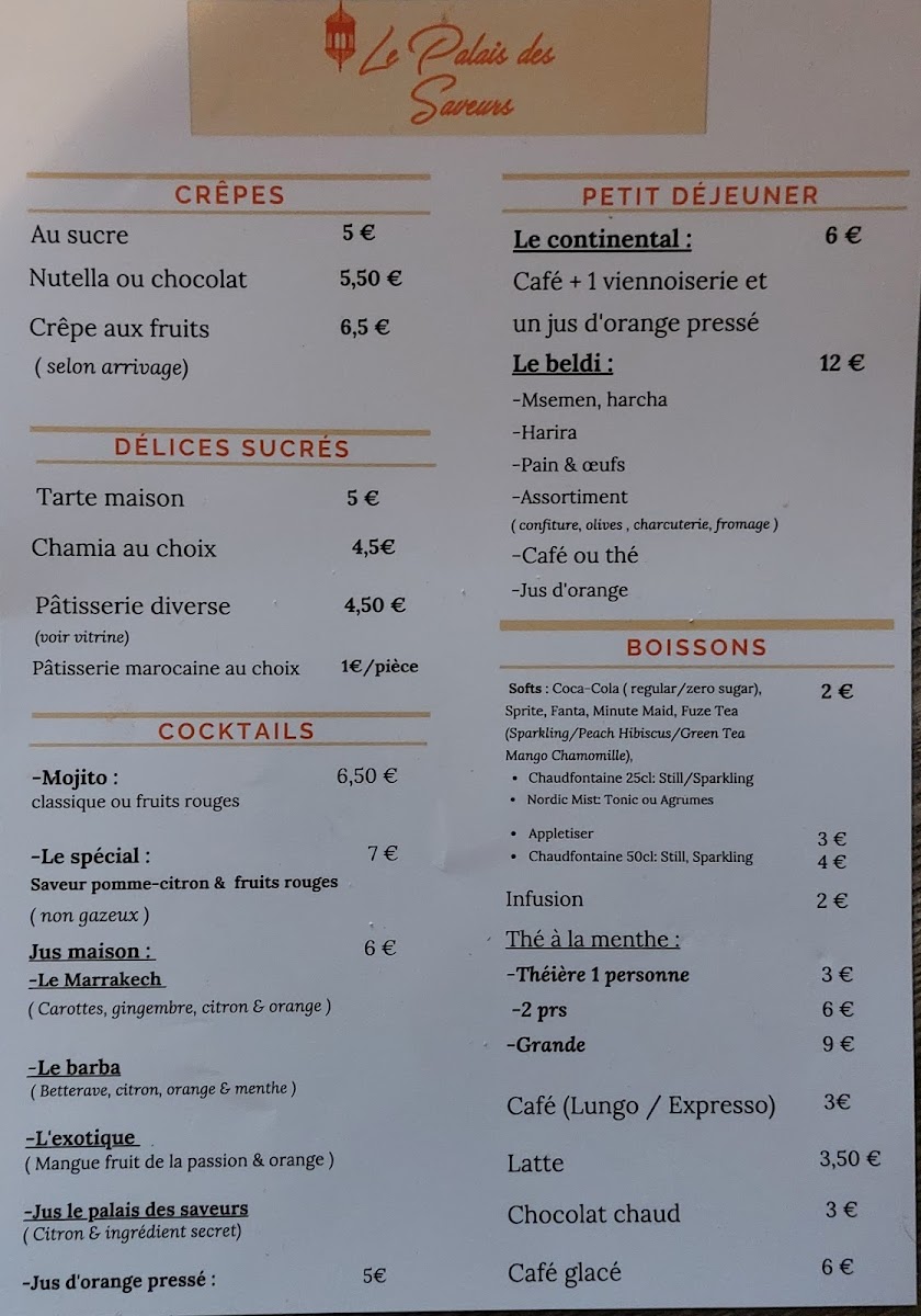 Le Palais des Saveurs offers a menu that reflects the warmth and tradition of Moroccan cuisine, presented in a welcoming, relaxed setting. The dishes invite you to enjoy comforting, richly spiced meals that suit both leisurely lunches and calm evening dinners.