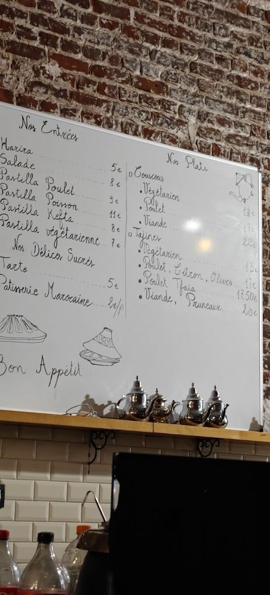 The menu features a range of classic Moroccan specialties such as tajines like the fragrant Tajine Viande Et Pruneaux, hearty Harira soup that’s perfect as a light starter or nourishing breakfast, and the delicate Pastilla Au Poulet, combining crispy pastry with savory filling. Complementing these are traditional drinks like Thé Marocaine and Marokkaanse Munt Tee, which bring a soothing, aromatic touch to any moment.